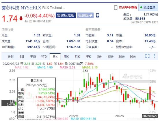 中国经济网北京7月27日讯 截至7月26日美股收盘,雾芯科技(NYSE:RLX)收报1.74美元,跌幅4.4%。该股自7月22日至今已连续3个交易日下跌,7月22日收盘报1.89美元,跌幅7.8%,7月25日收盘报1.82美元,跌幅3.7%。